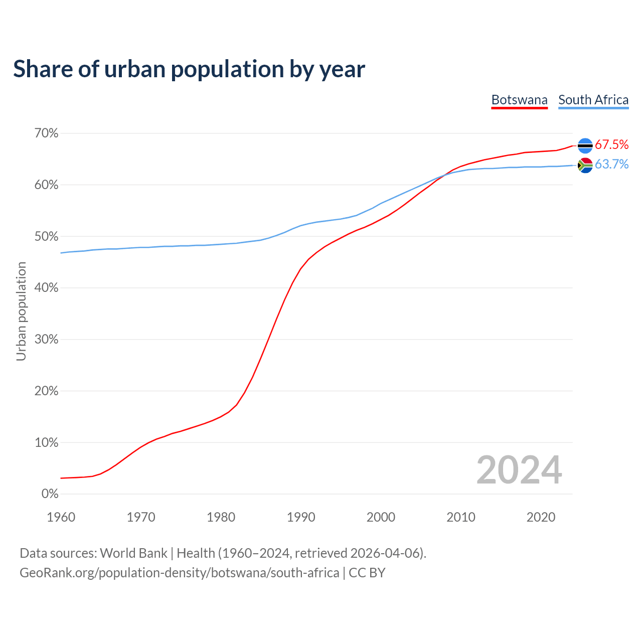 From 2004 to 2024, the share of urban population changed from 57.3% to 67.5% in Botswana and from 59.1% to 63.7% in South Africa.