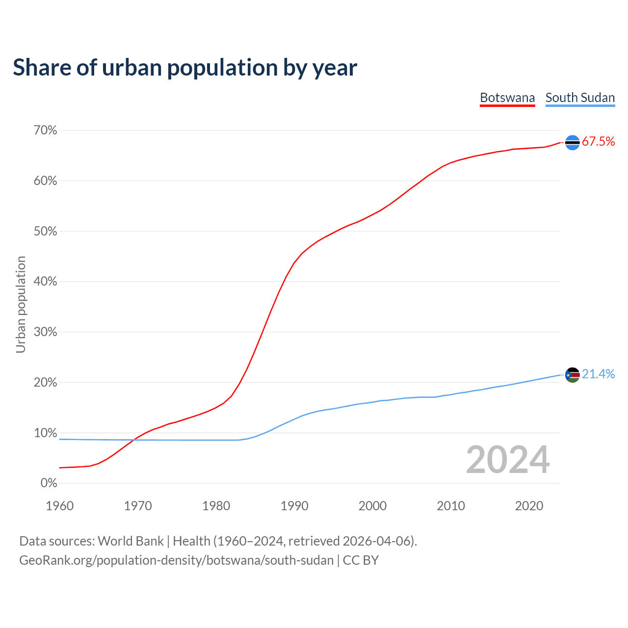 From 2004 to 2024, the share of urban population changed from 57.3% to 67.5% in Botswana and from 16.8% to 21.4% in South Sudan.