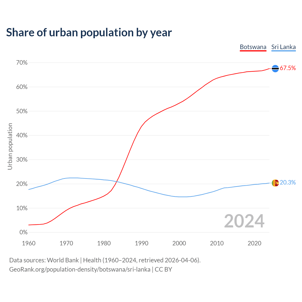 From 2004 to 2024, the share of urban population changed from 57.3% to 67.5% in Botswana and from 14.9% to 20.3% in Sri Lanka.