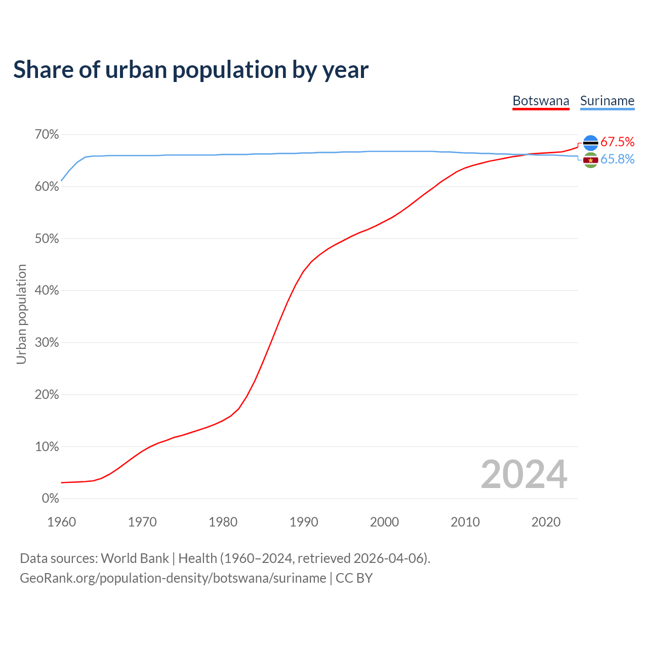 From 2004 to 2024, the share of urban population changed from 57.3% to 67.5% in Botswana and from 66.7% to 65.8% in Suriname.