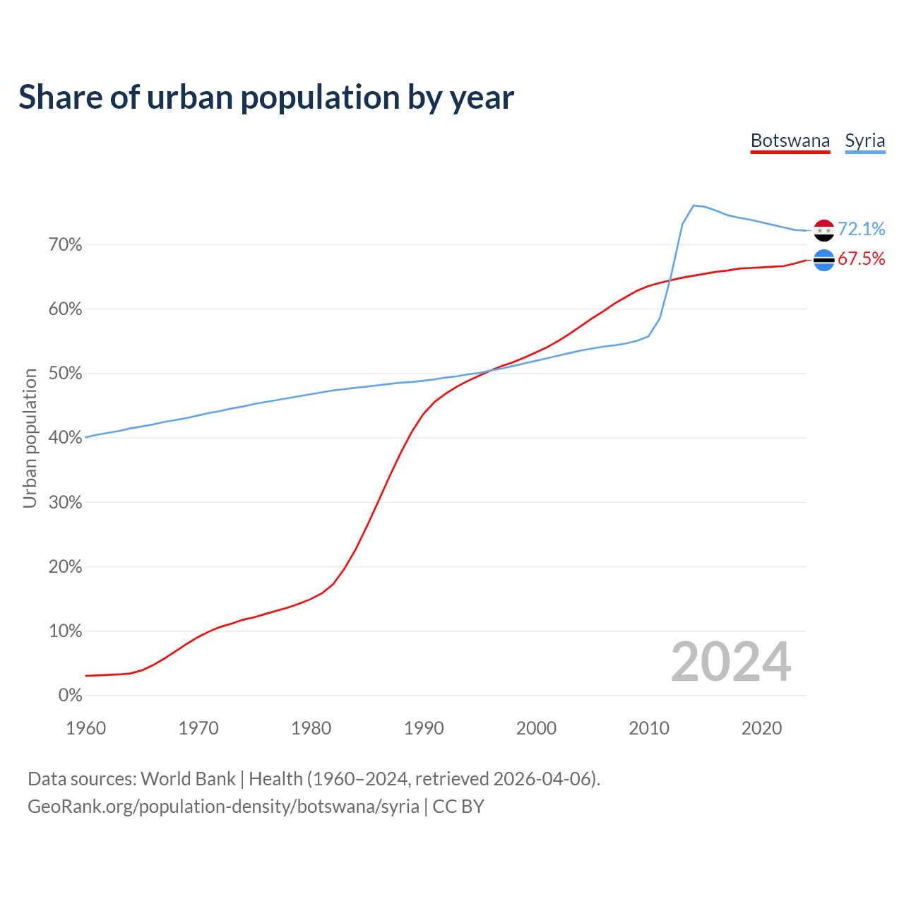 From 2004 to 2024, the share of urban population changed from 57.3% to 67.5% in Botswana and from 53.5% to 72.1% in Syria.