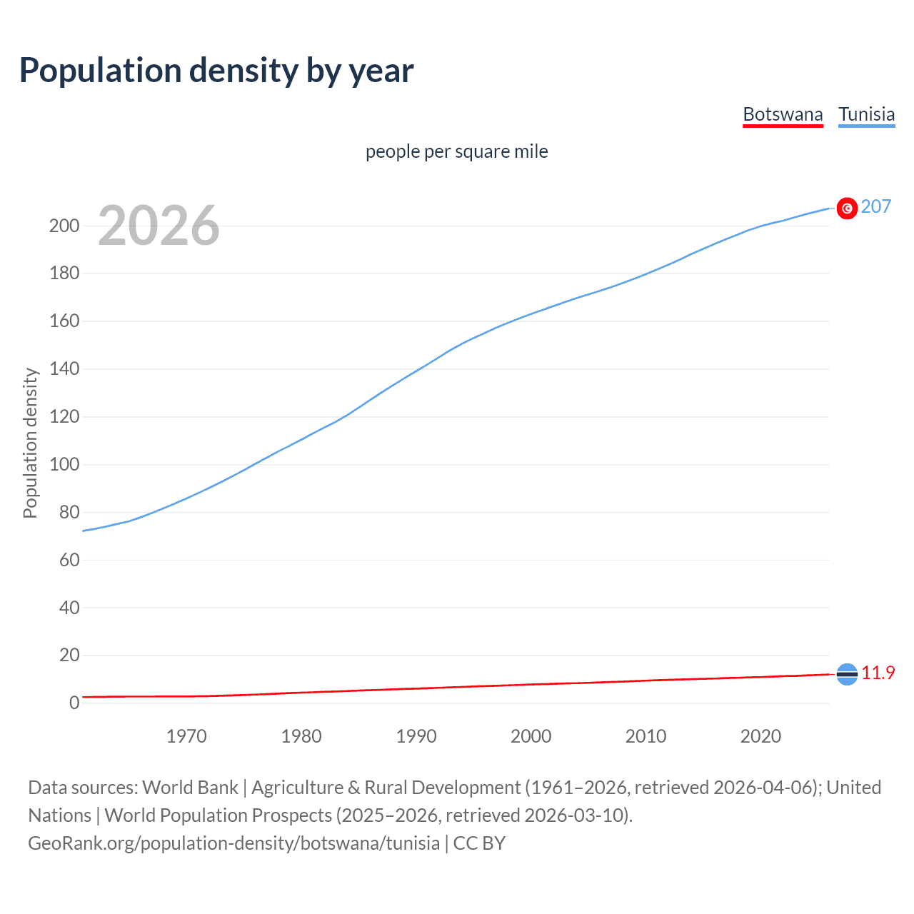Botswana has a population density of 11.9 people per square mile compared to 207.1 people in Tunisia. Botswana has 2,483,705 sq ft of land per person vs 143,444 sq ft in Tunisia. Botswana and Tunisia rank 190th and 110th by population density, respectively.