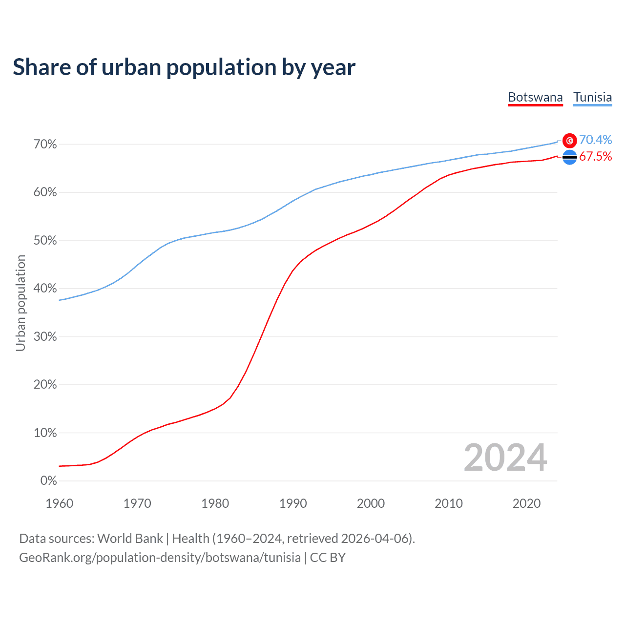 From 2004 to 2024, the share of urban population changed from 57.3% to 67.5% in Botswana and from 64.9% to 70.4% in Tunisia.