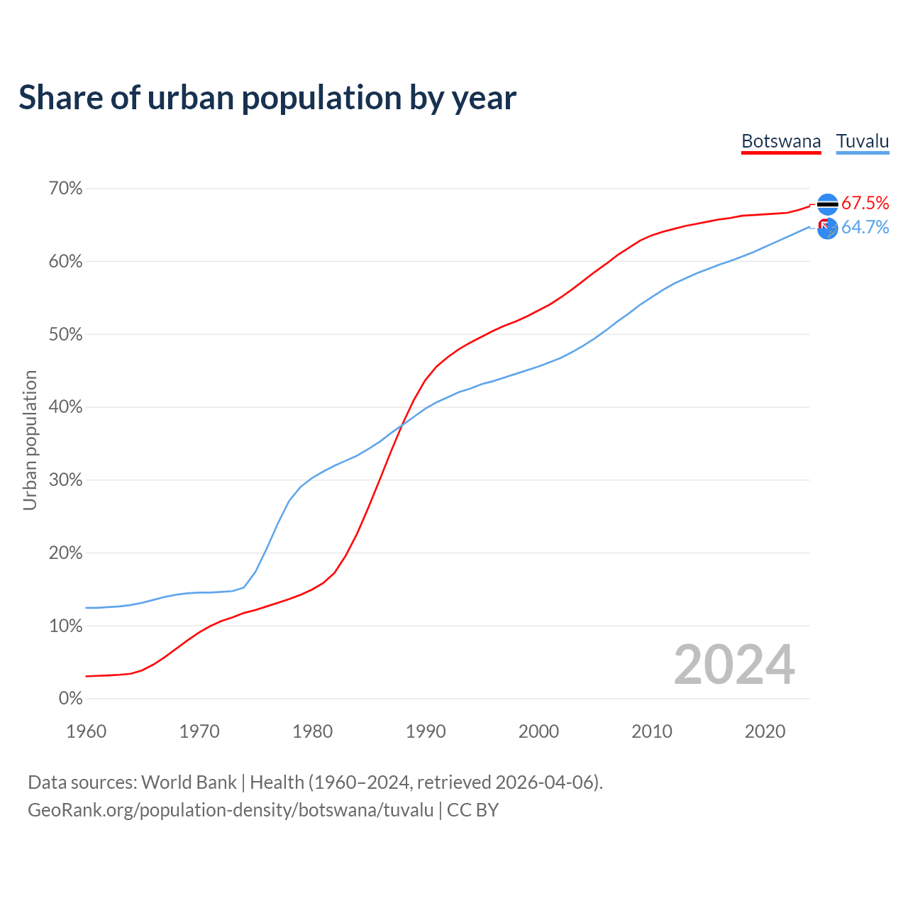From 2004 to 2024, the share of urban population changed from 57.3% to 67.5% in Botswana and from 48.4% to 64.7% in Tuvalu.