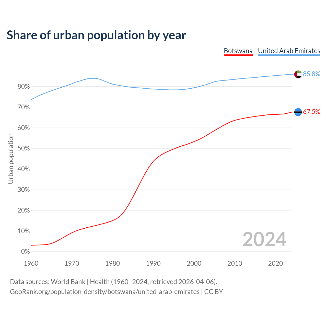 From 2004 to 2024, the share of urban population changed from 57.3% to 67.5% in Botswana and from 81.5% to 85.8% in the United Arab Emirates.