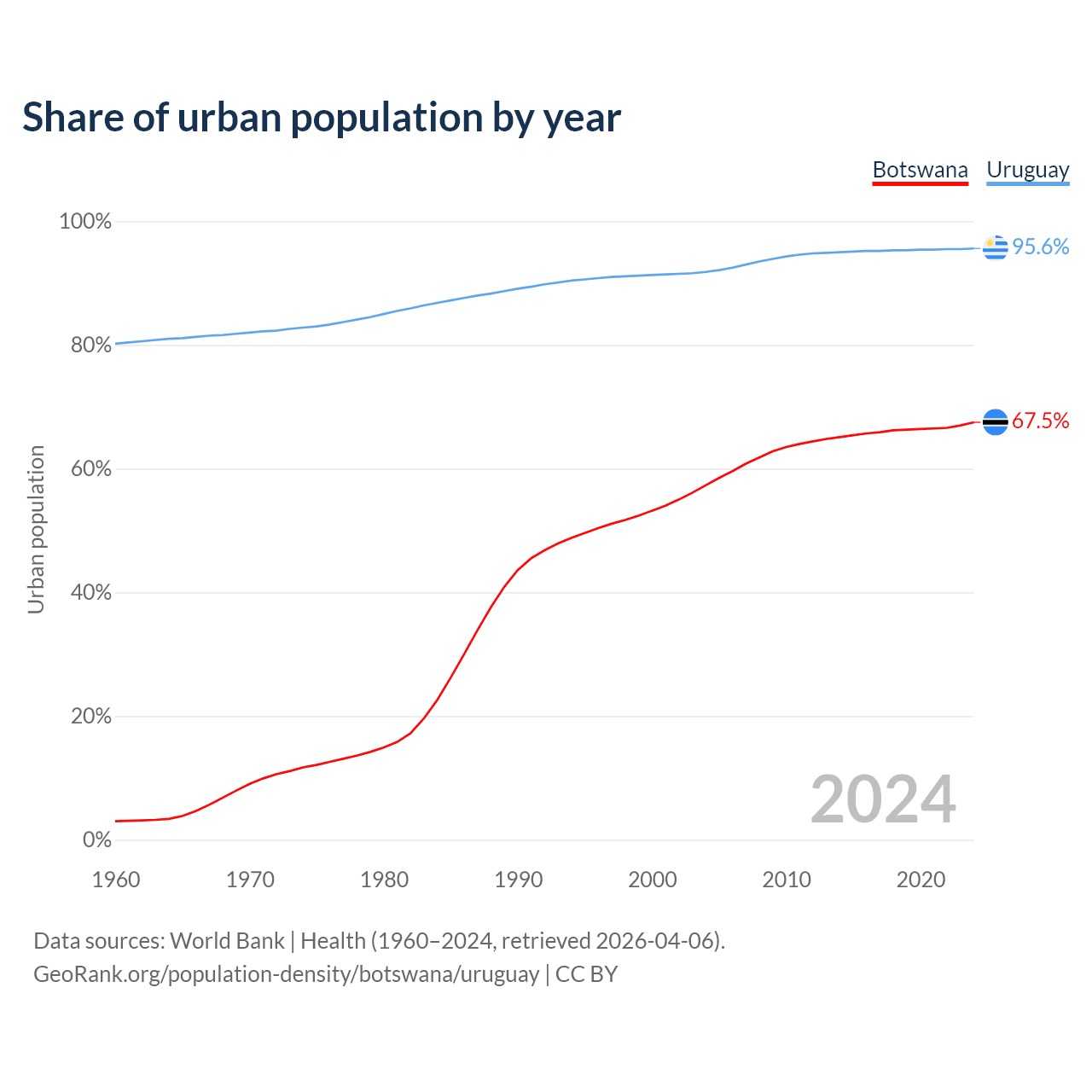 From 2004 to 2024, the share of urban population changed from 57.3% to 67.5% in Botswana and from 91.8% to 95.6% in Uruguay.