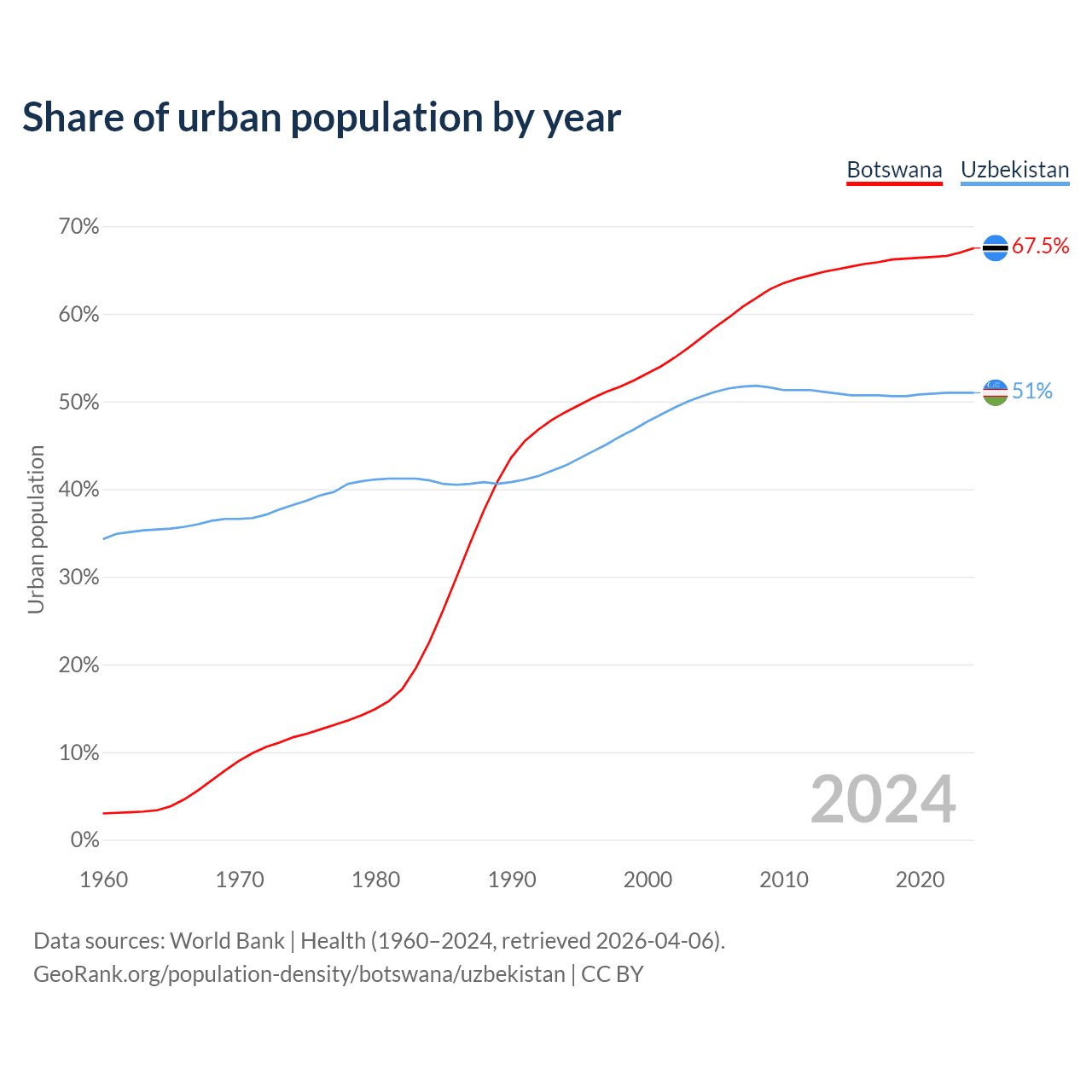 From 2004 to 2024, the share of urban population changed from 57.3% to 67.5% in Botswana and from 50.6% to 51% in Uzbekistan.
