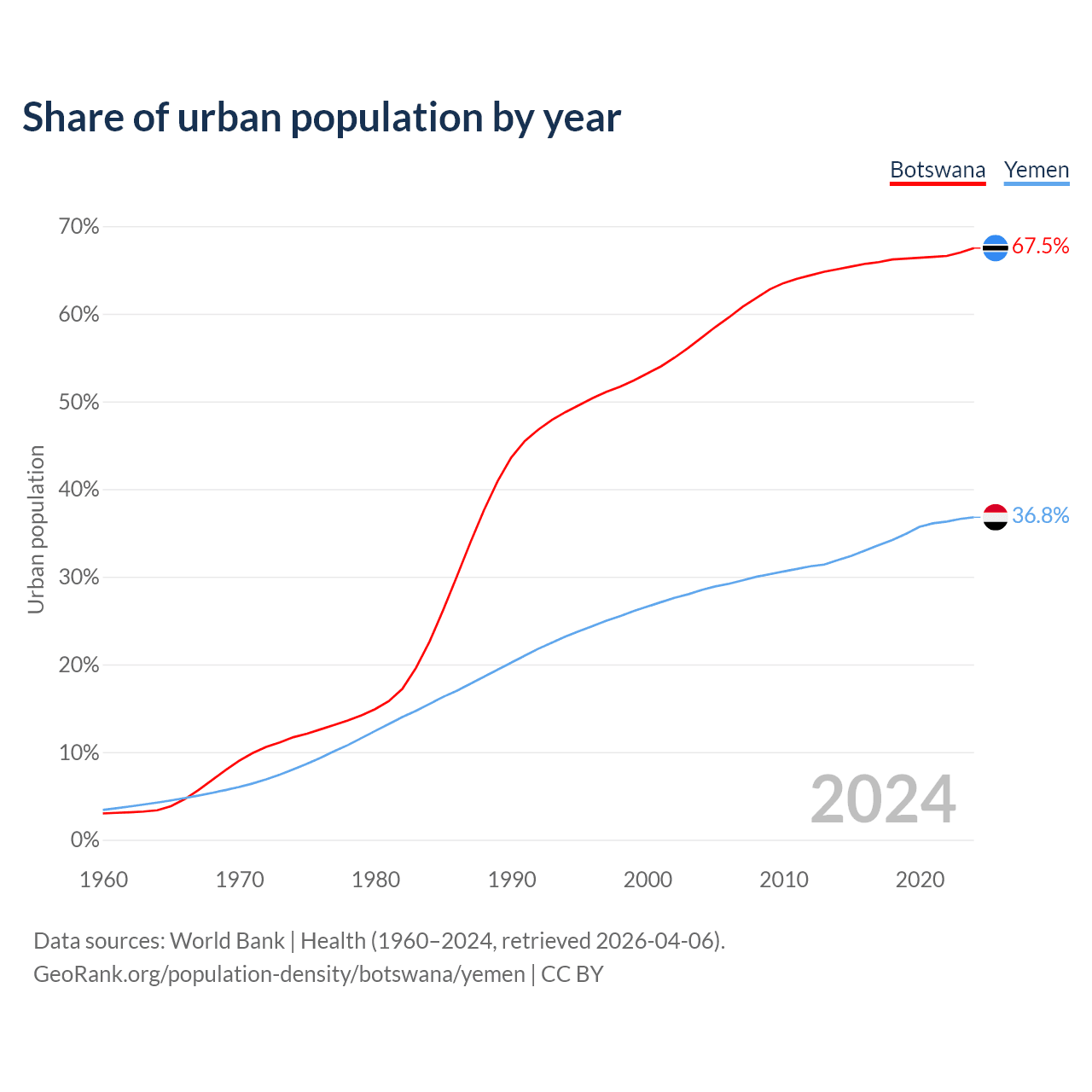 From 2004 to 2024, the share of urban population changed from 57.3% to 67.5% in Botswana and from 28.5% to 36.8% in Yemen.