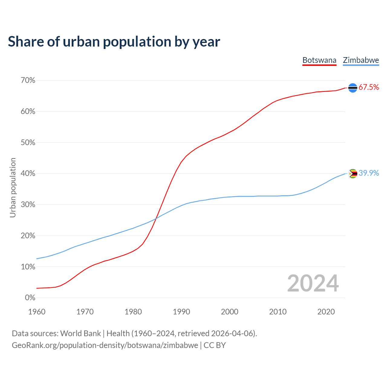 From 2004 to 2024, the share of urban population changed from 57.3% to 67.5% in Botswana and from 32.6% to 39.9% in Zimbabwe.