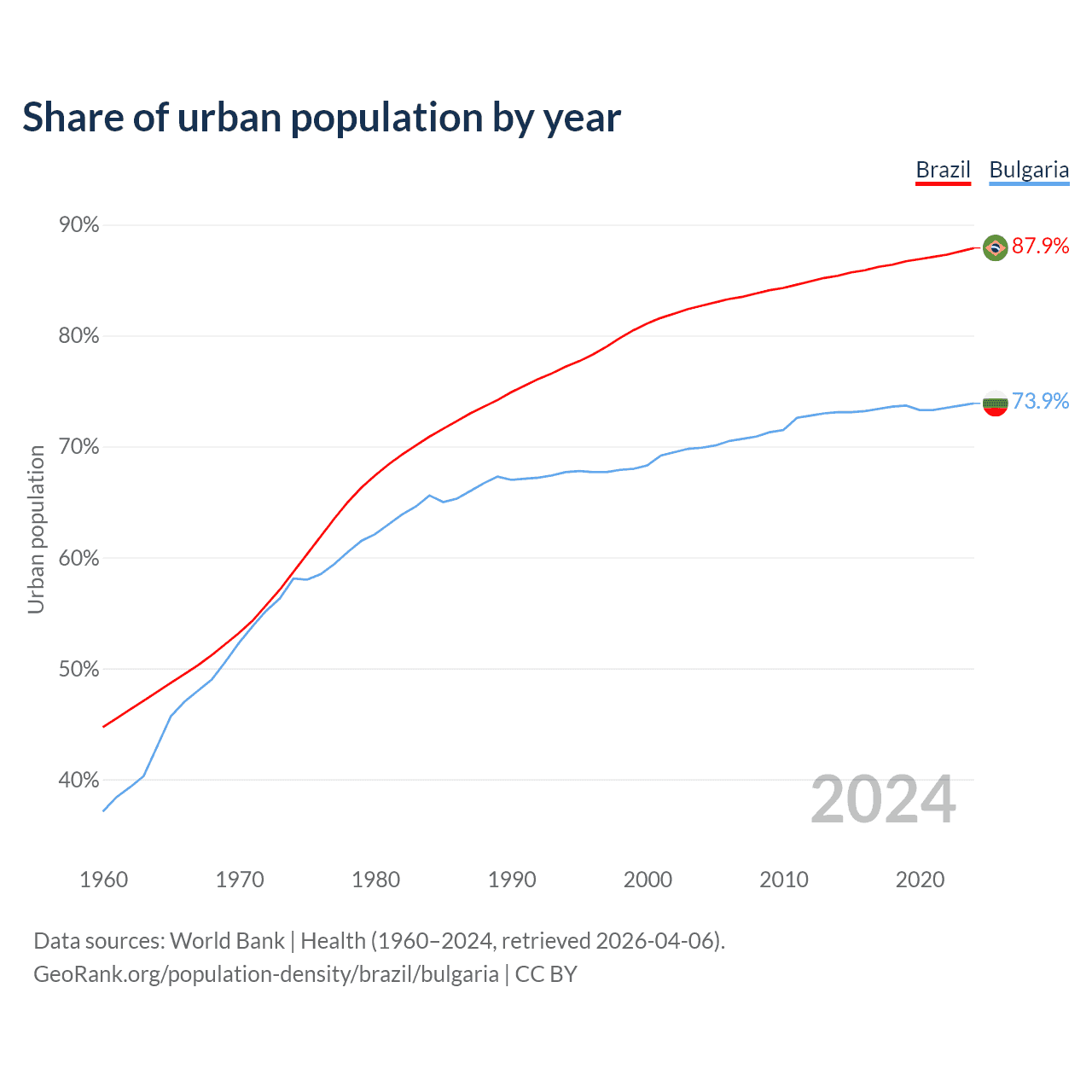 From 2004 to 2024, the share of urban population changed from 82.7% to 87.9% in Brazil and from 69.9% to 73.9% in Bulgaria.