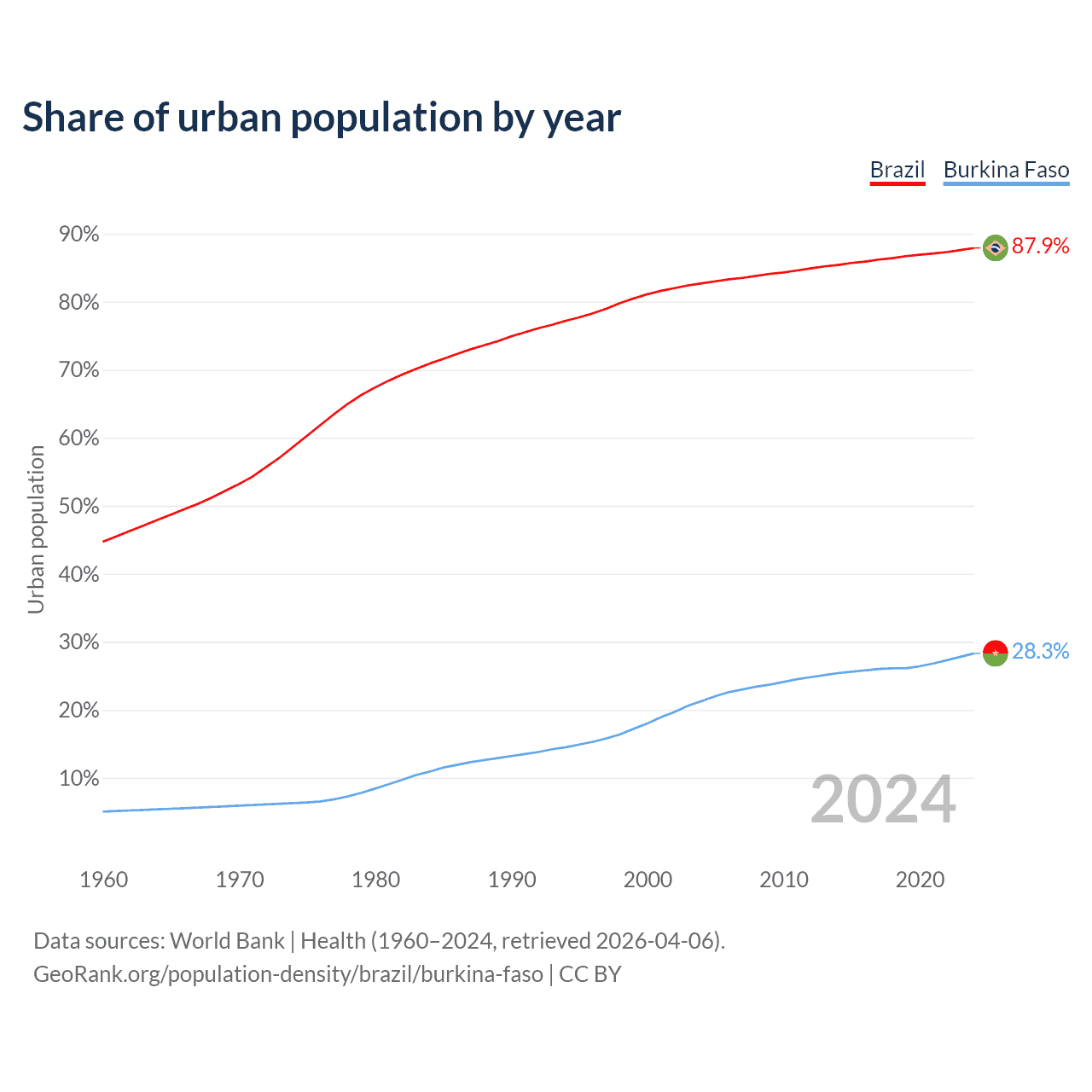 From 2004 to 2024, the share of urban population changed from 82.7% to 87.9% in Brazil and from 21.3% to 28.3% in Burkina Faso.