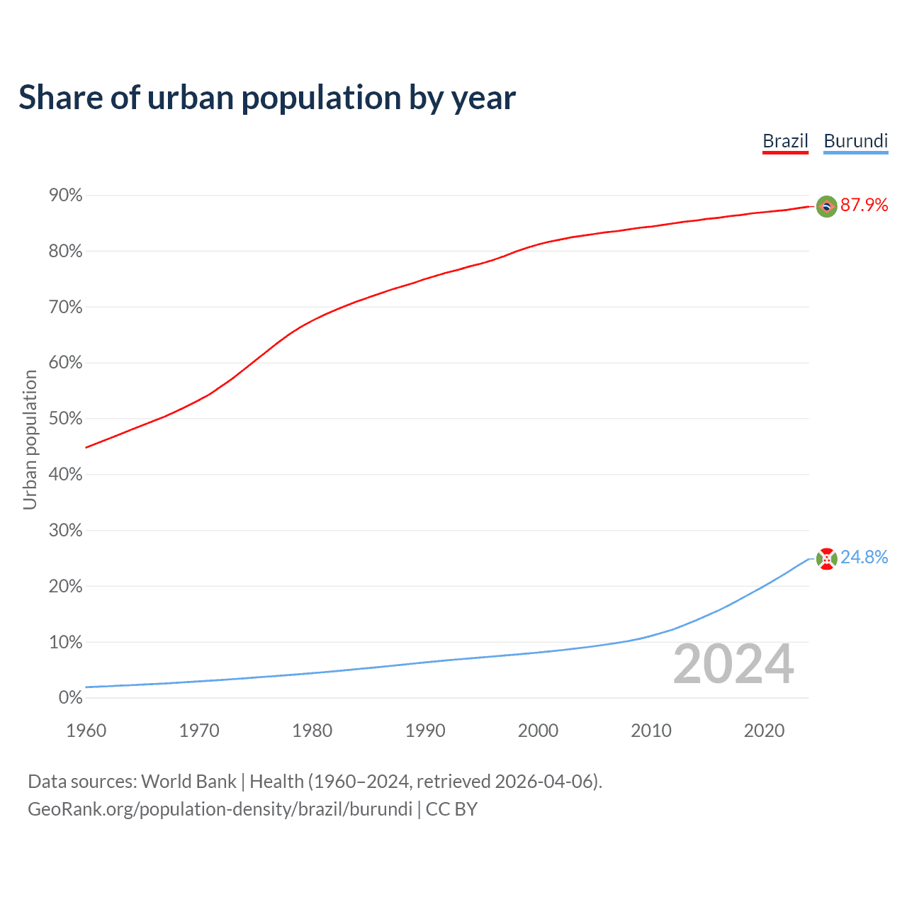 From 2004 to 2024, the share of urban population changed from 82.7% to 87.9% in Brazil and from 8.92% to 24.8% in Burundi.