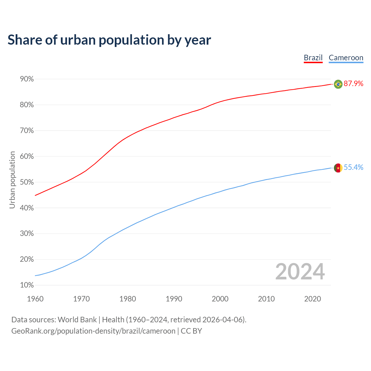 From 2004 to 2024, the share of urban population changed from 82.7% to 87.9% in Brazil and from 48.2% to 55.4% in Cameroon.