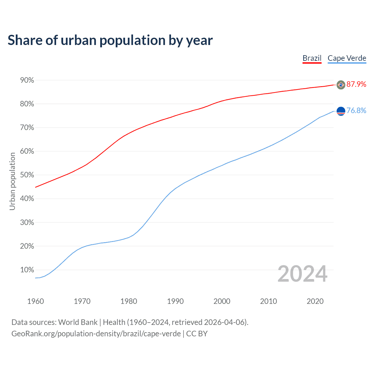 From 2004 to 2024, the share of urban population changed from 82.7% to 87.9% in Brazil and from 57.1% to 76.8% in Cape Verde.