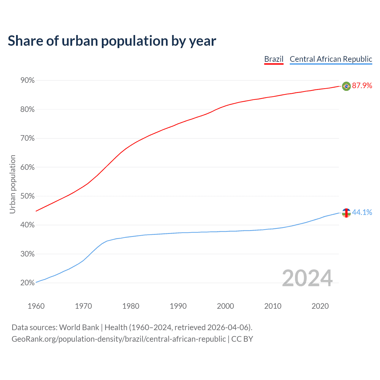 From 2004 to 2024, the share of urban population changed from 82.7% to 87.9% in Brazil and from 38% to 44.1% in the Central African Republic.