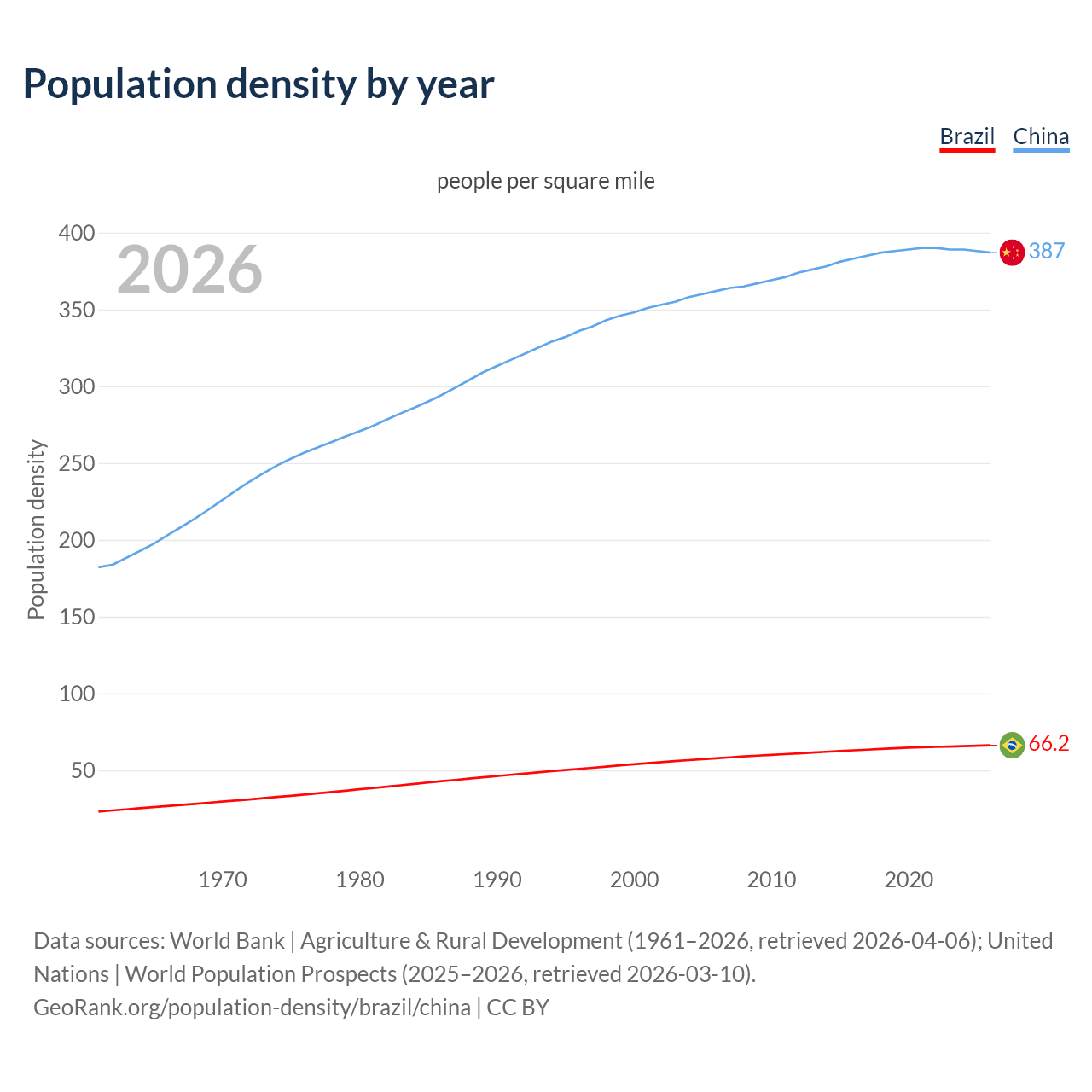Brazil has a population density of 66.2 people per square mile compared to 387 people in China. Brazil has 432,375 sq ft of land per person vs 73,316 sq ft in China. Brazil and China rank 164th and 67th by population density, respectively.