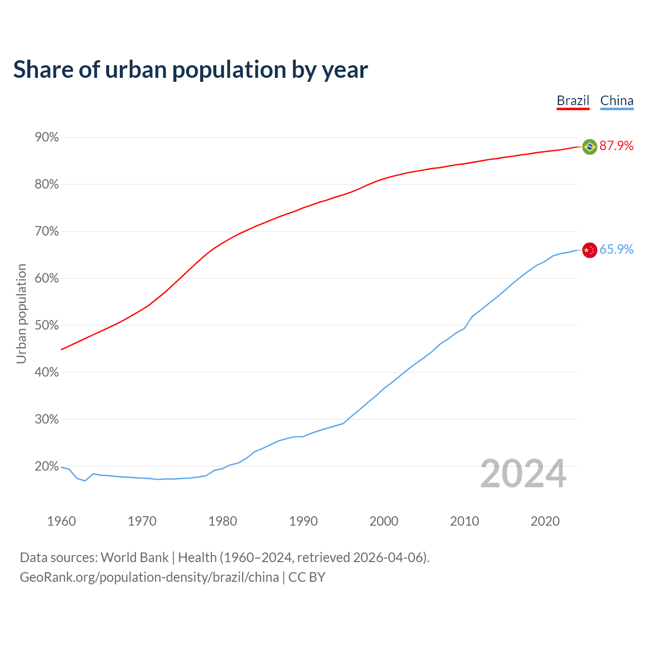 From 2004 to 2024, the share of urban population changed from 82.7% to 87.9% in Brazil and from 41.8% to 65.9% in China.