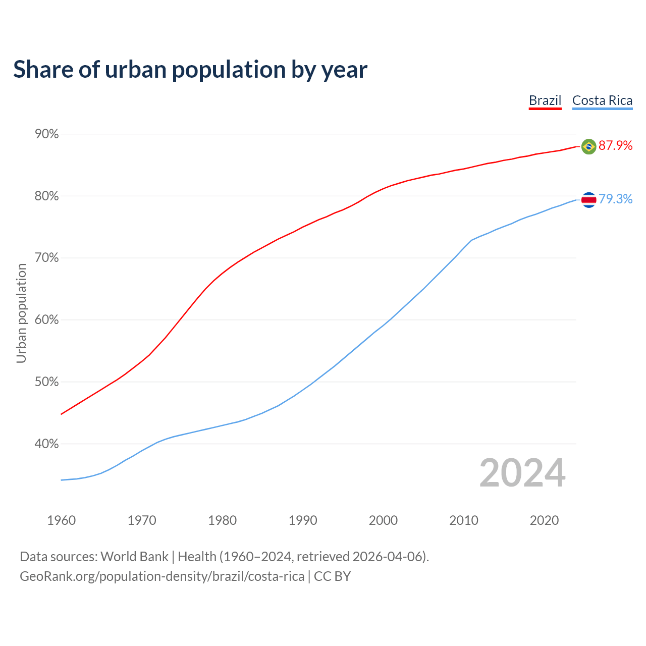 From 2004 to 2024, the share of urban population changed from 82.7% to 87.9% in Brazil and from 63.7% to 79.3% in Costa Rica.