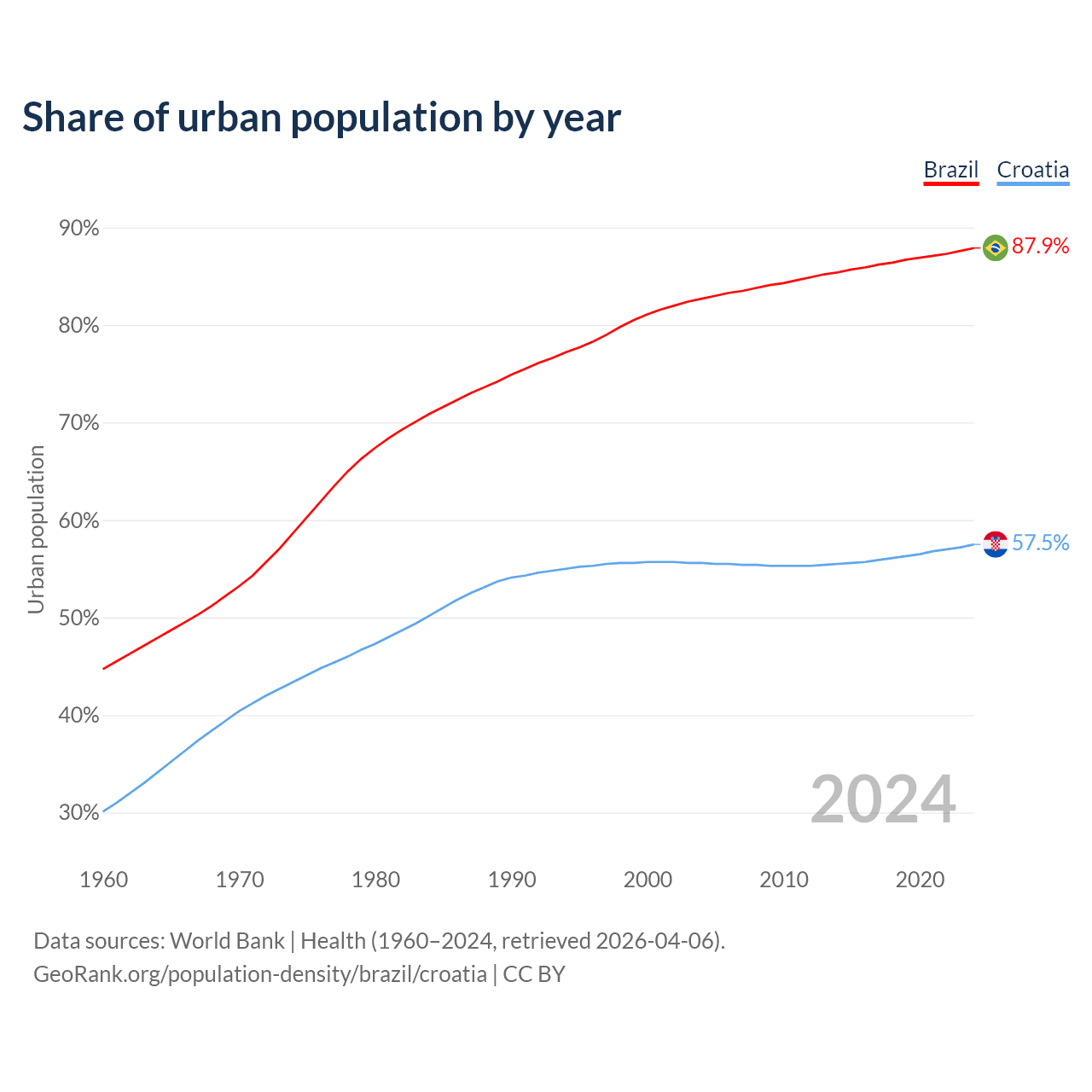 From 2004 to 2024, the share of urban population changed from 82.7% to 87.9% in Brazil and from 55.6% to 57.5% in Croatia.