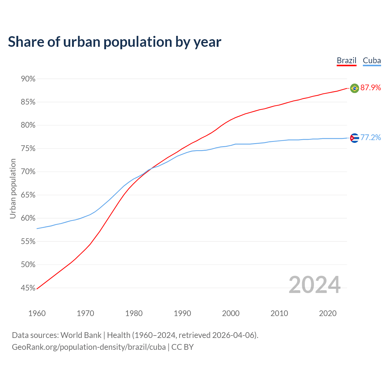 From 2004 to 2024, the share of urban population changed from 82.7% to 87.9% in Brazil and from 75.9% to 77.2% in Cuba.