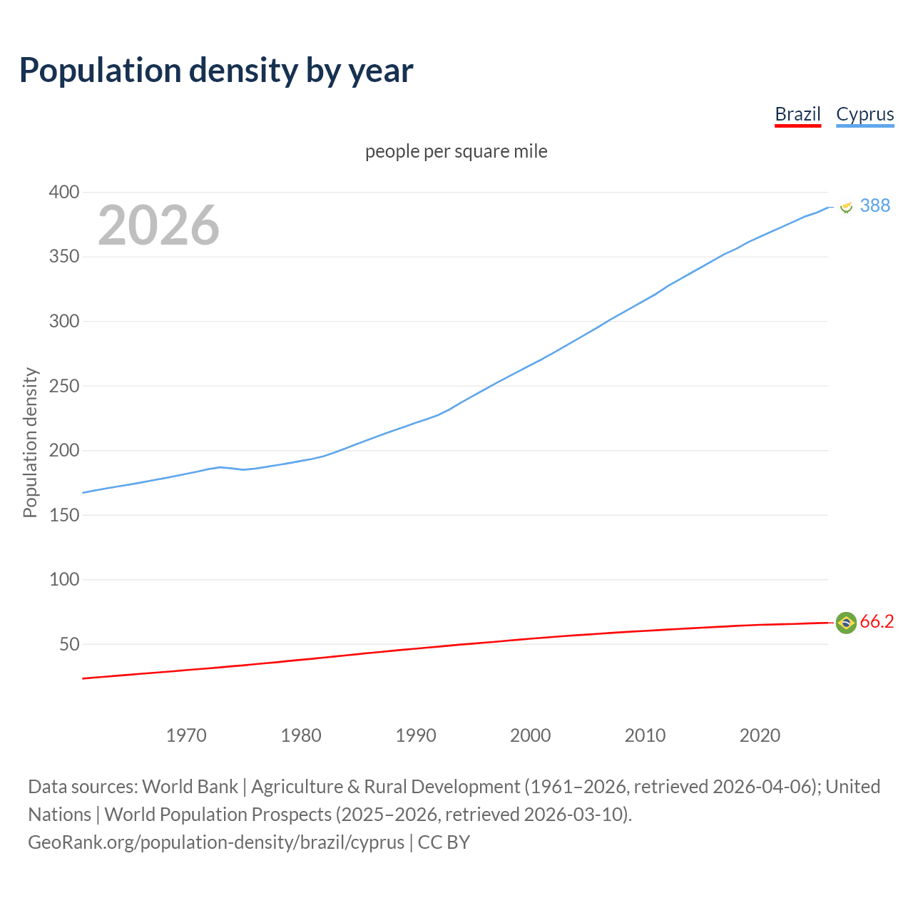 Brazil has a population density of 66.2 people per square mile compared to 388 people in Cyprus. Brazil has 432,375 sq ft of land per person vs 73,243 sq ft in Cyprus. Brazil and Cyprus rank 164th and 66th by population density, respectively.