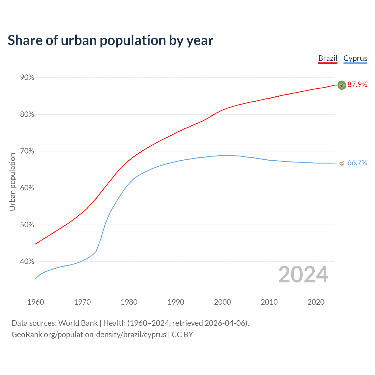 From 2004 to 2024, the share of urban population changed from 82.7% to 87.9% in Brazil and from 68.6% to 66.7% in Cyprus.