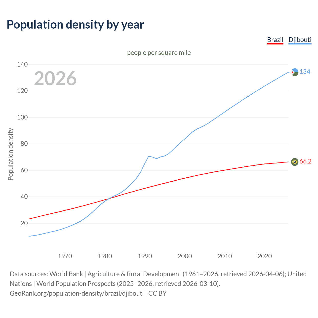 From 2006 to 2026, population density in Brazil increased by 14.5%, compared to a 40.2% growth in Djibouti.
