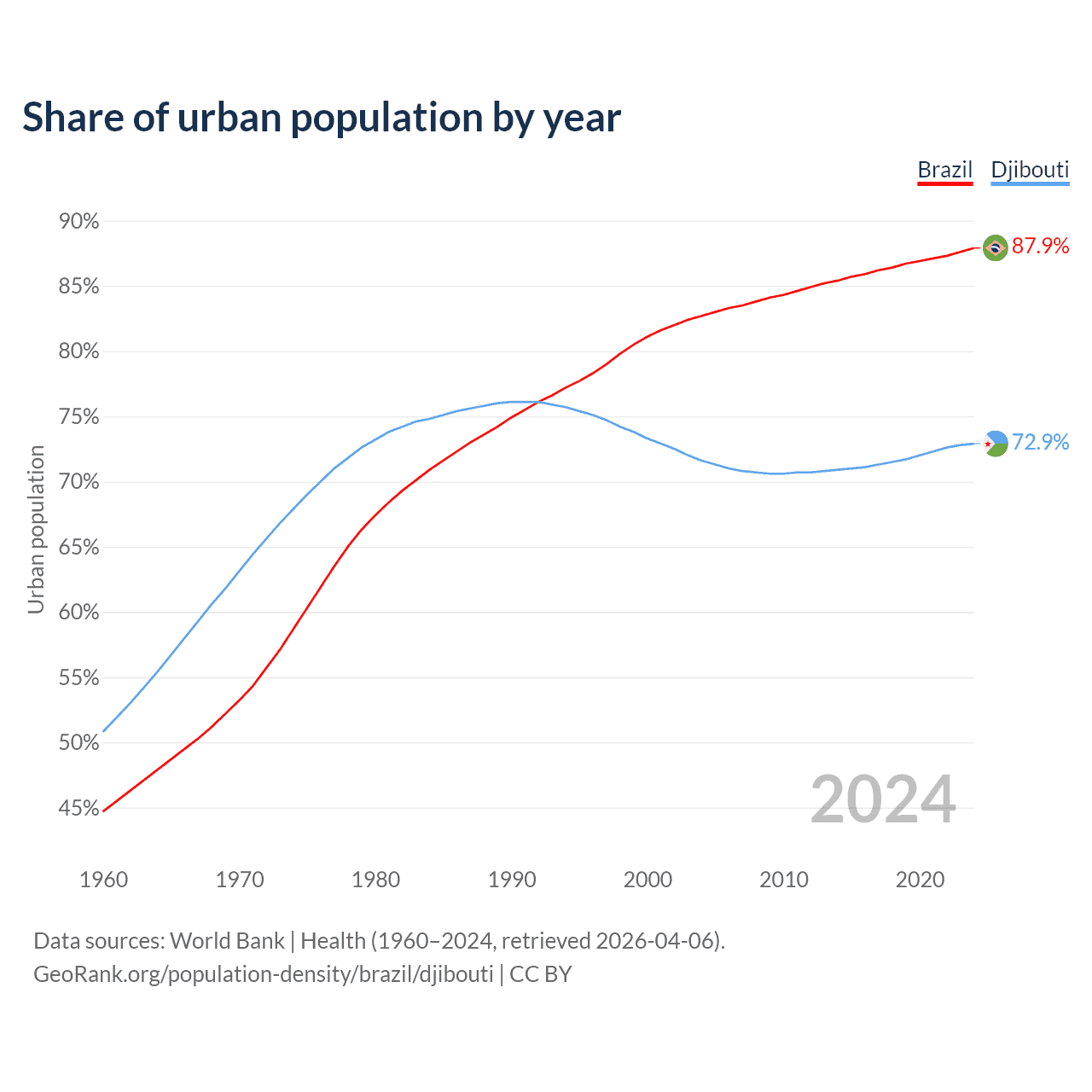 From 2004 to 2024, the share of urban population changed from 82.7% to 87.9% in Brazil and from 71.6% to 72.9% in Djibouti.