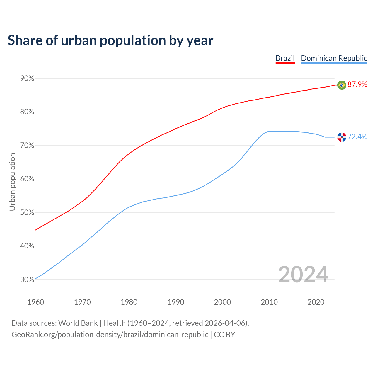 From 2004 to 2024, the share of urban population changed from 82.7% to 87.9% in Brazil and from 65.9% to 72.4% in the Dominican Republic.