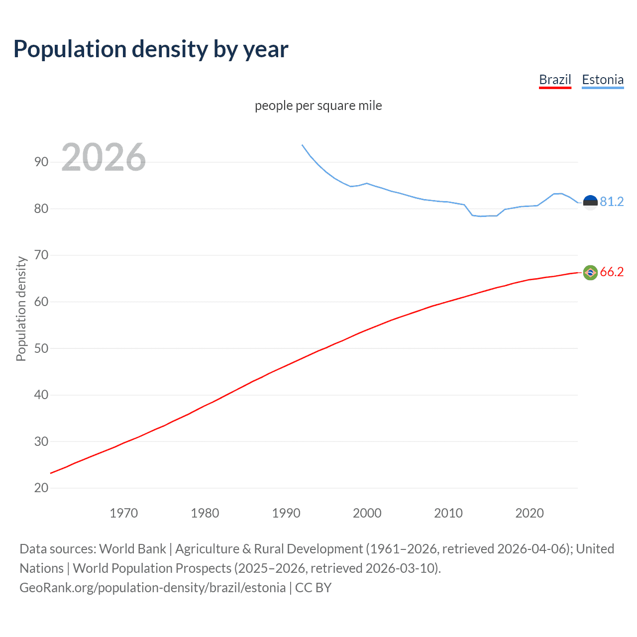 From 2006 to 2026, population density in Brazil increased by 14.5%, compared to a 1.33% decline in Estonia.