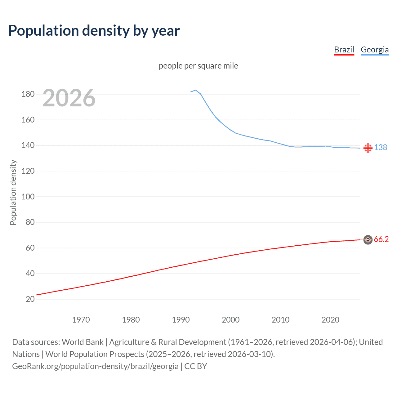 From 2006 to 2026, population density in Brazil increased by 14.5%, compared to a 4.71% decline in Georgia.