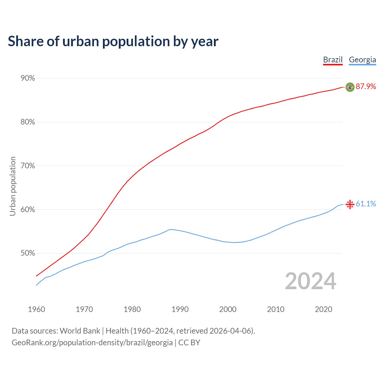From 2004 to 2024, the share of urban population changed from 82.7% to 87.9% in Brazil and from 52.7% to 61.1% in Georgia.