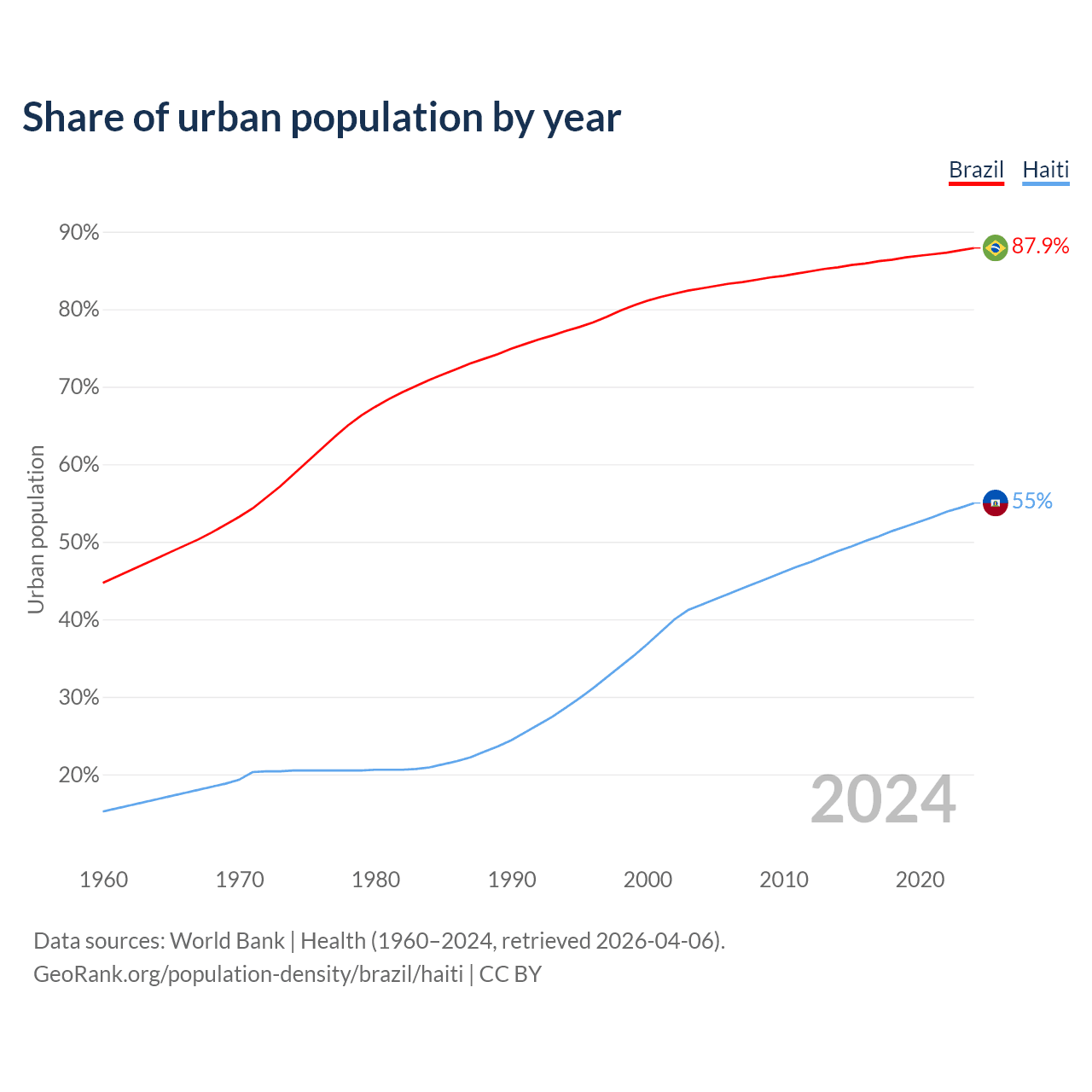 From 2004 to 2024, the share of urban population changed from 82.7% to 87.9% in Brazil and from 41.9% to 55% in Haiti.