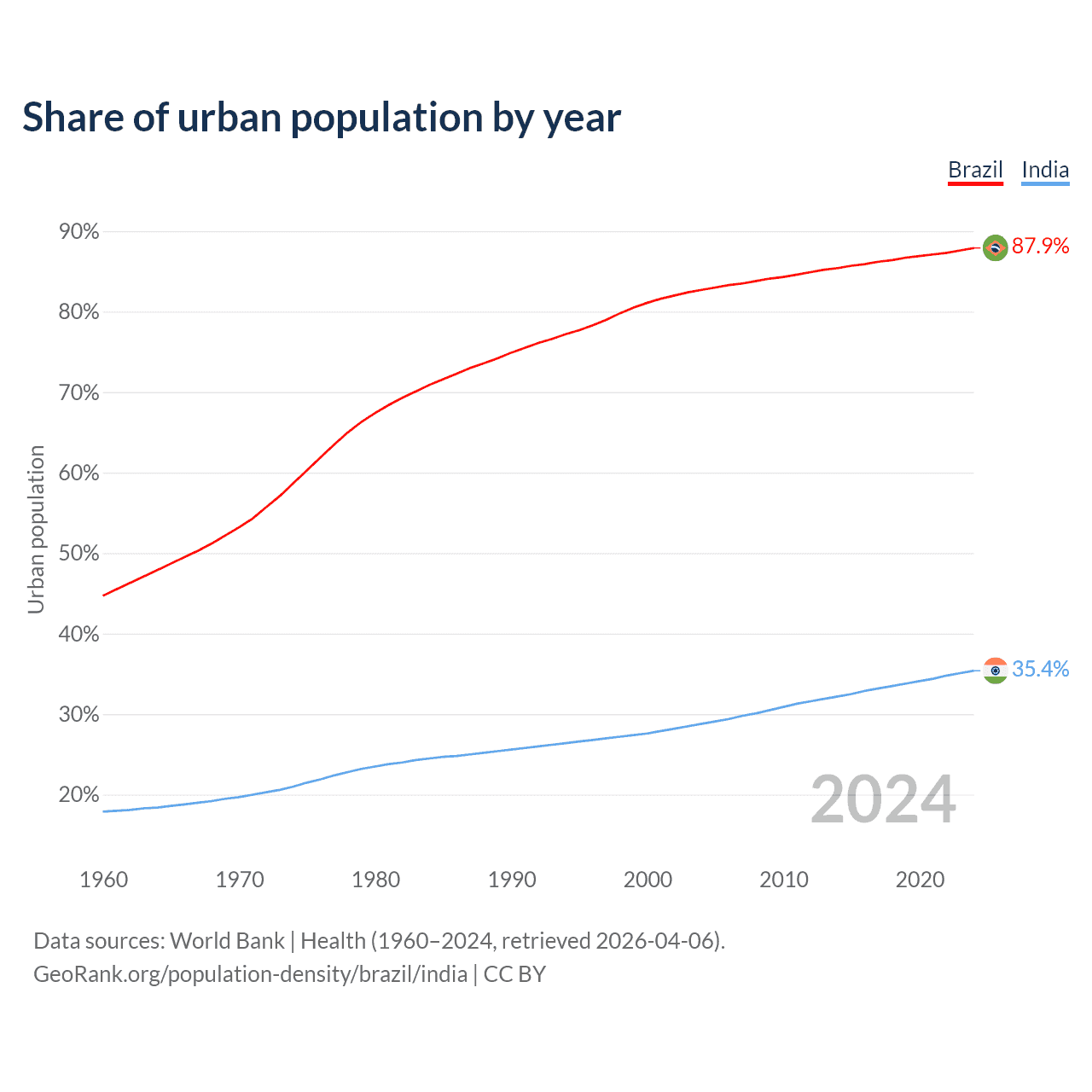 From 2004 to 2024, the share of urban population changed from 82.7% to 87.9% in Brazil and from 28.8% to 35.4% in India.