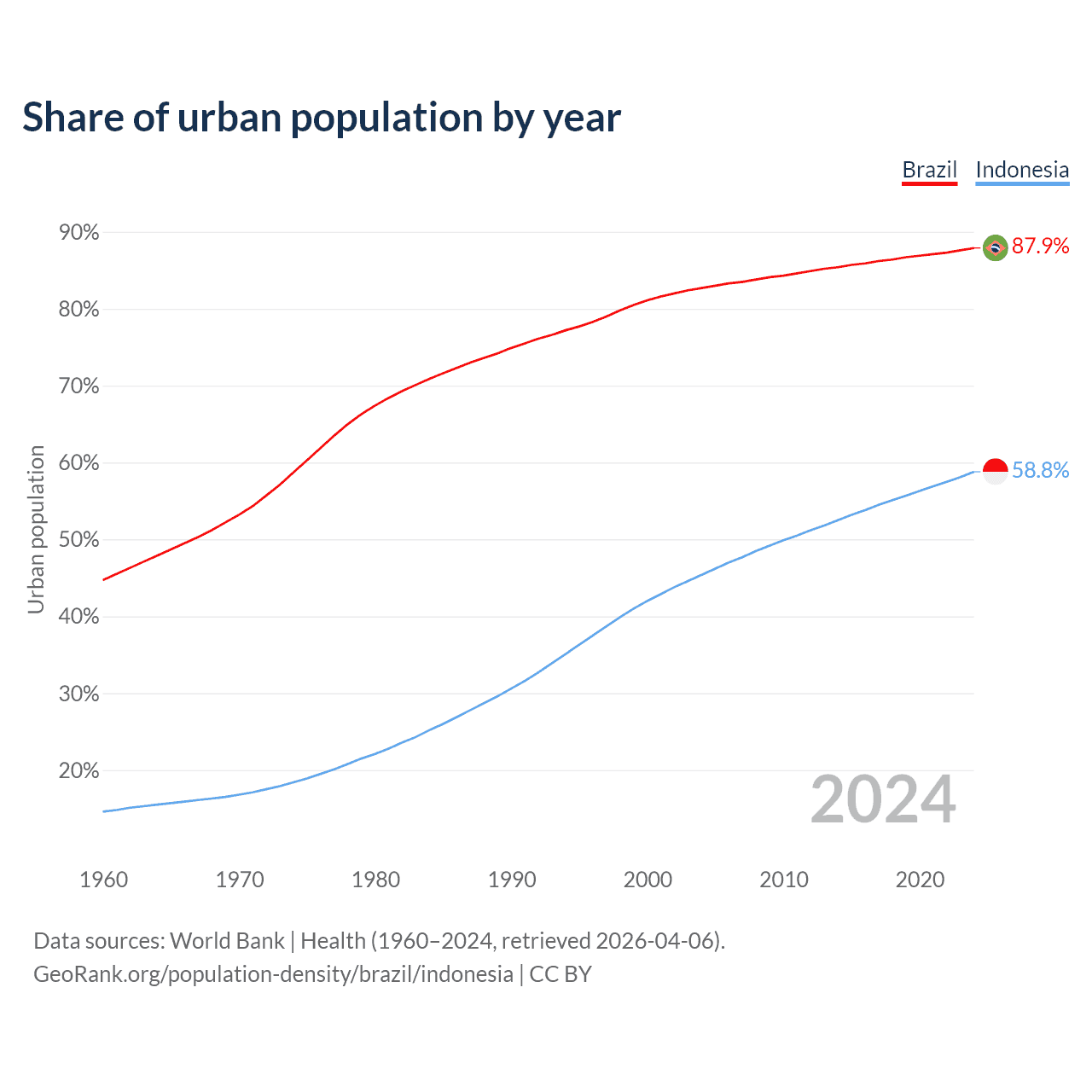 From 2004 to 2024, the share of urban population changed from 82.7% to 87.9% in Brazil and from 45.4% to 58.8% in Indonesia.