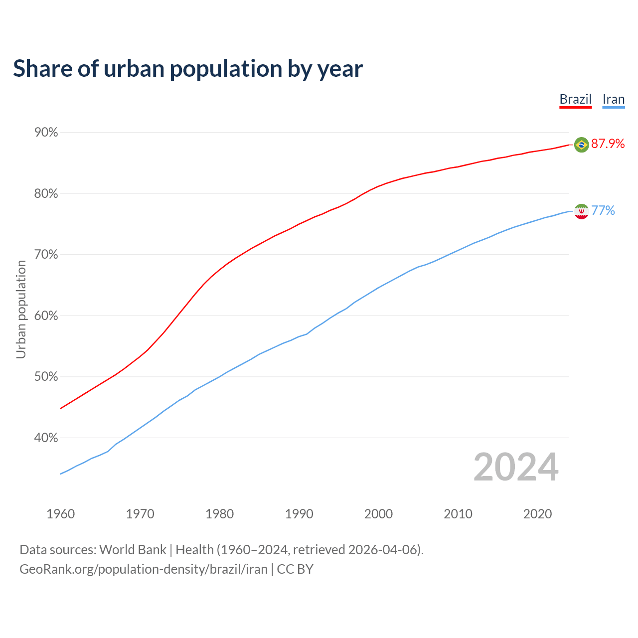 From 2004 to 2024, the share of urban population changed from 82.7% to 87.9% in Brazil and from 67.3% to 77% in Iran.