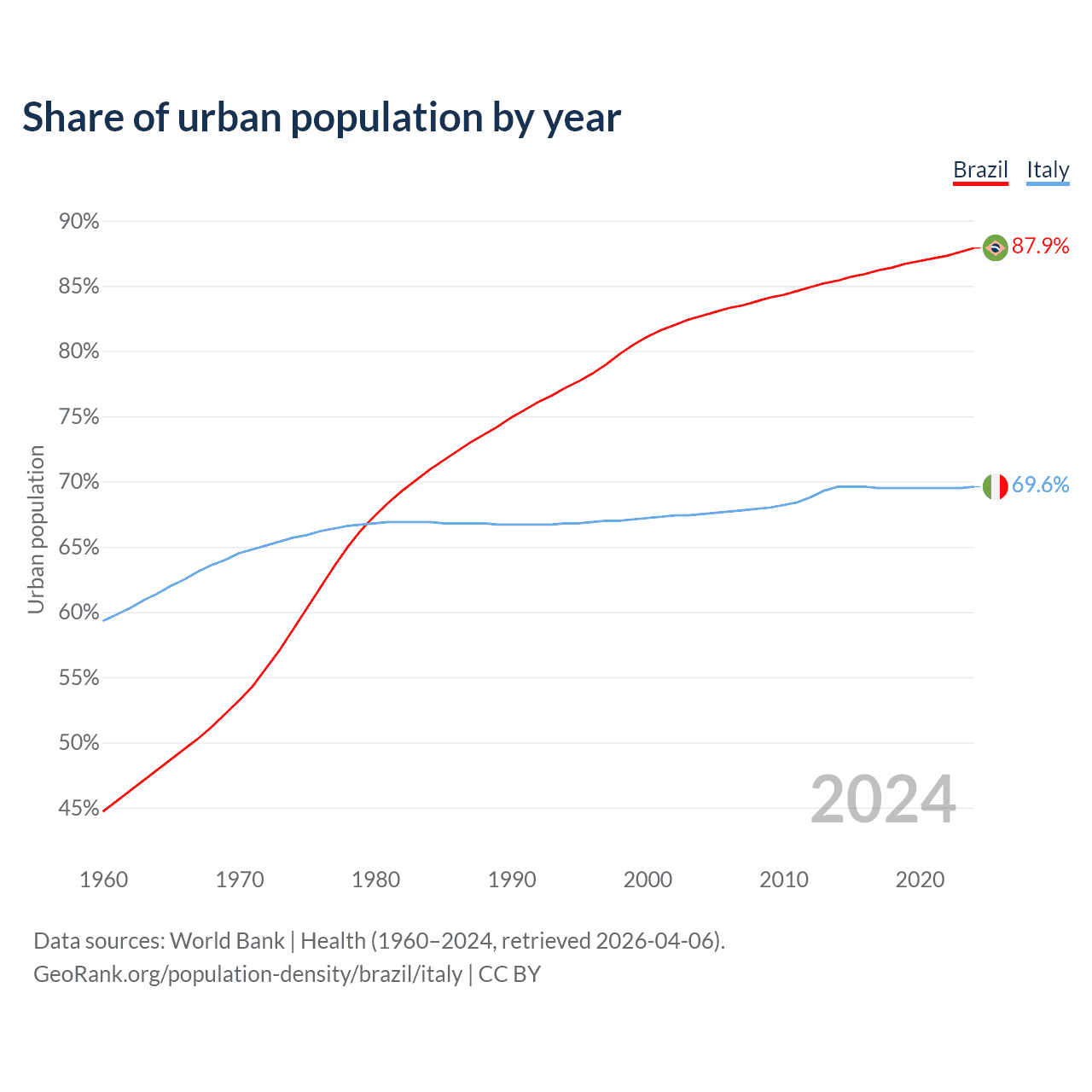 From 2004 to 2024, the share of urban population changed from 82.7% to 87.9% in Brazil and from 67.5% to 69.6% in Italy.