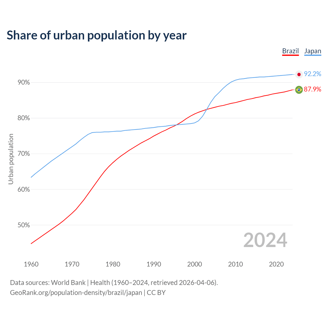 From 2004 to 2024, the share of urban population changed from 82.7% to 87.9% in Brazil and from 84.4% to 92.2% in Japan.