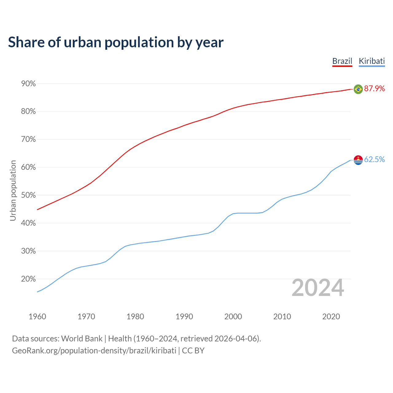 From 2004 to 2024, the share of urban population changed from 82.7% to 87.9% in Brazil and from 43.5% to 62.5% in Kiribati.
