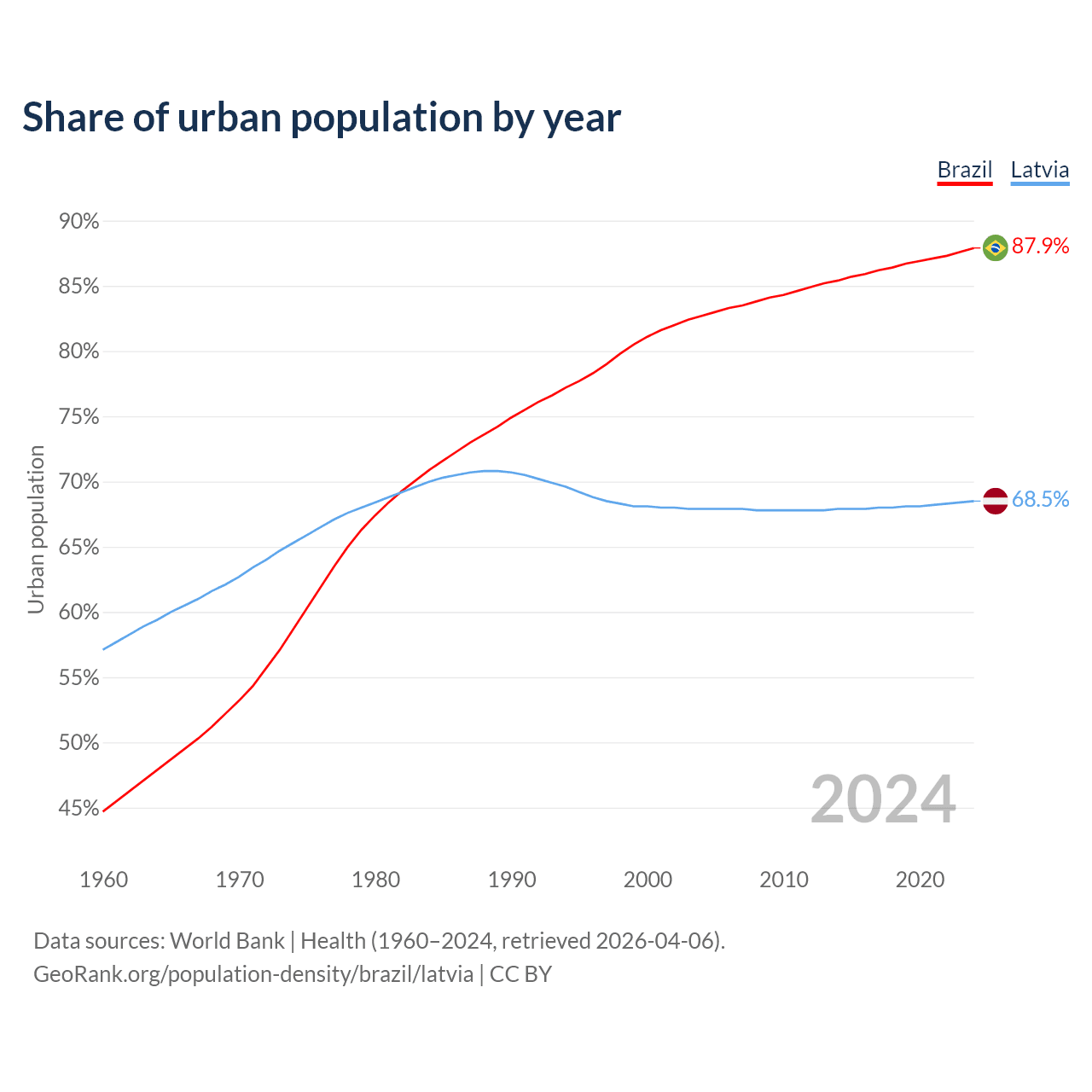 From 2004 to 2024, the share of urban population changed from 82.7% to 87.9% in Brazil and from 67.9% to 68.5% in Latvia.