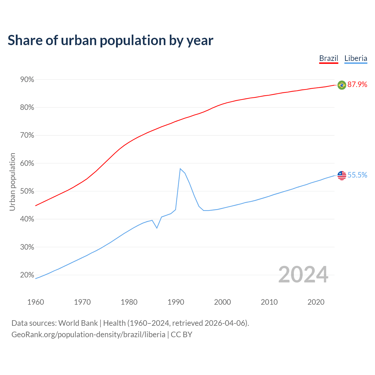From 2004 to 2024, the share of urban population changed from 82.7% to 87.9% in Brazil and from 45.4% to 55.5% in Liberia.