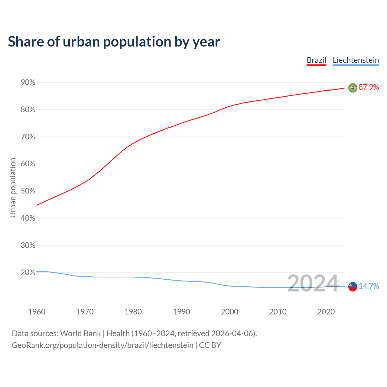 From 2004 to 2024, the share of urban population changed from 82.7% to 87.9% in Brazil and from 14.7% to 14.7% in Liechtenstein.