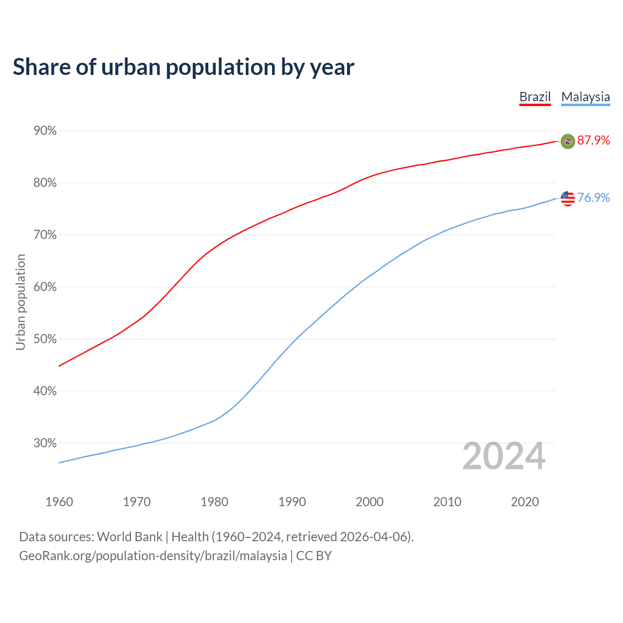 From 2004 to 2024, the share of urban population changed from 82.7% to 87.9% in Brazil and from 66.1% to 76.9% in Malaysia.