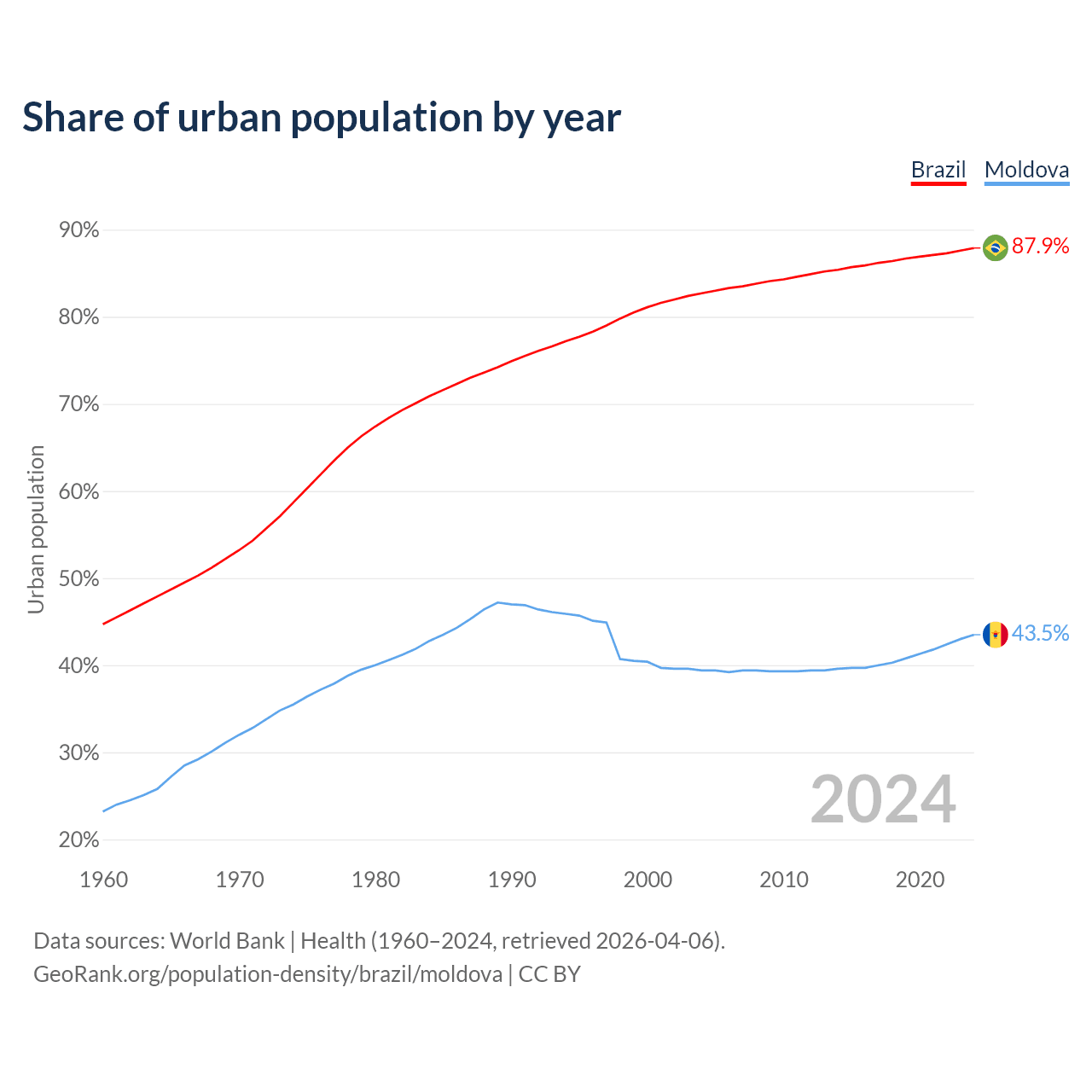 From 2004 to 2024, the share of urban population changed from 82.7% to 87.9% in Brazil and from 39.4% to 43.5% in Moldova.
