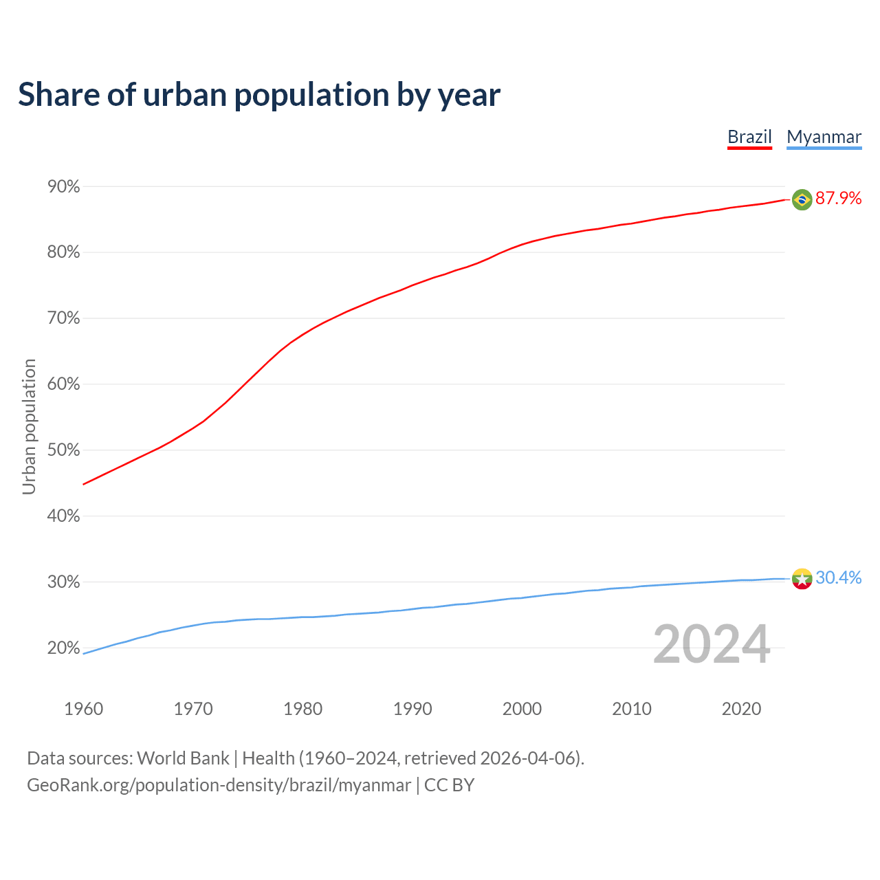 From 2004 to 2024, the share of urban population changed from 82.7% to 87.9% in Brazil and from 28.2% to 30.4% in Myanmar.