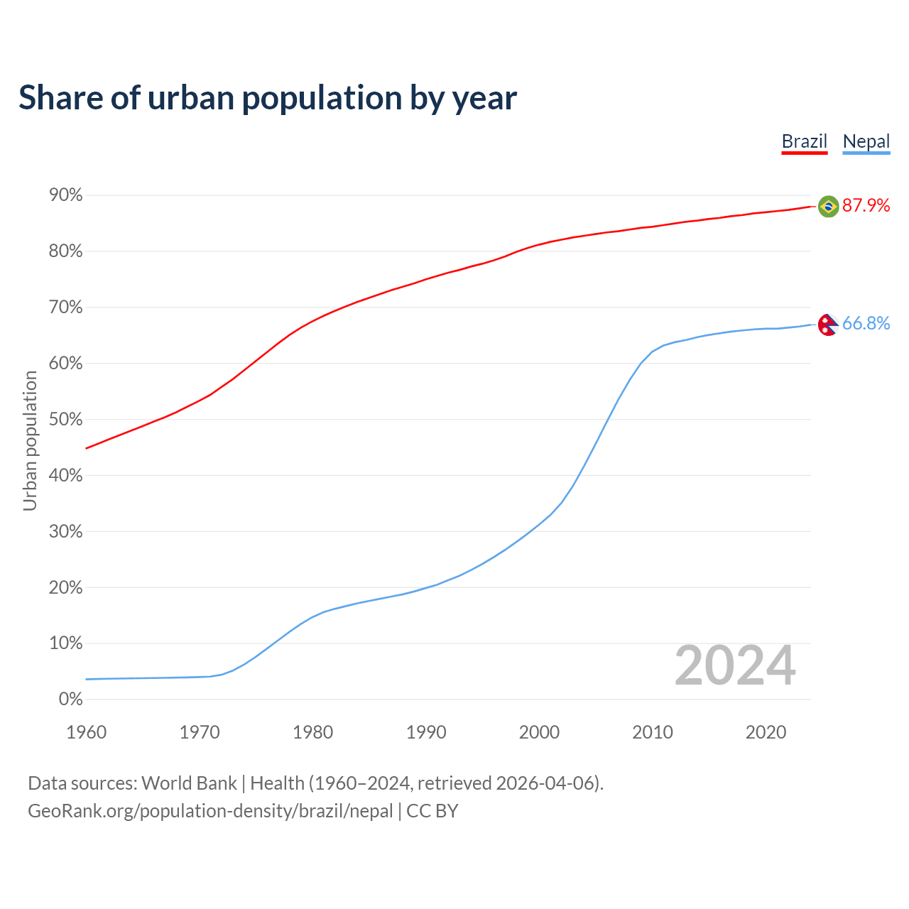 From 2004 to 2024, the share of urban population changed from 82.7% to 87.9% in Brazil and from 41.6% to 66.8% in Nepal.