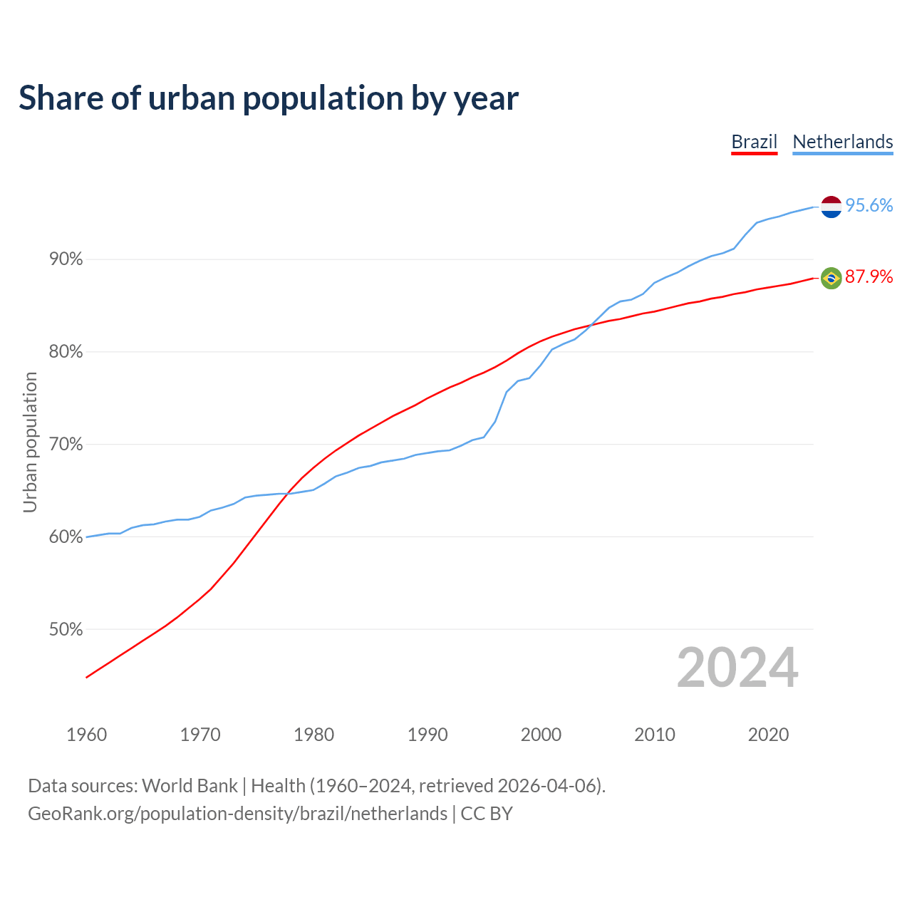 From 2004 to 2024, the share of urban population changed from 82.7% to 87.9% in Brazil and from 82.3% to 95.6% in the Netherlands.
