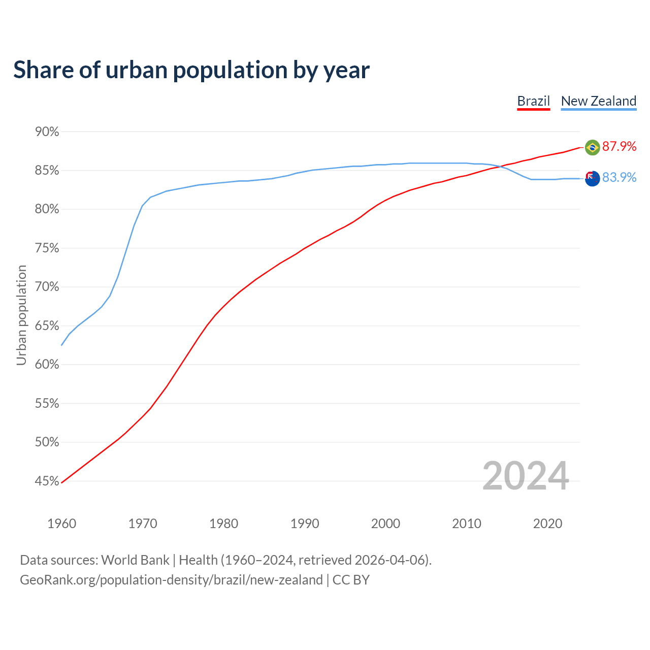 From 2004 to 2024, the share of urban population changed from 82.7% to 87.9% in Brazil and from 85.9% to 83.9% in New Zealand.