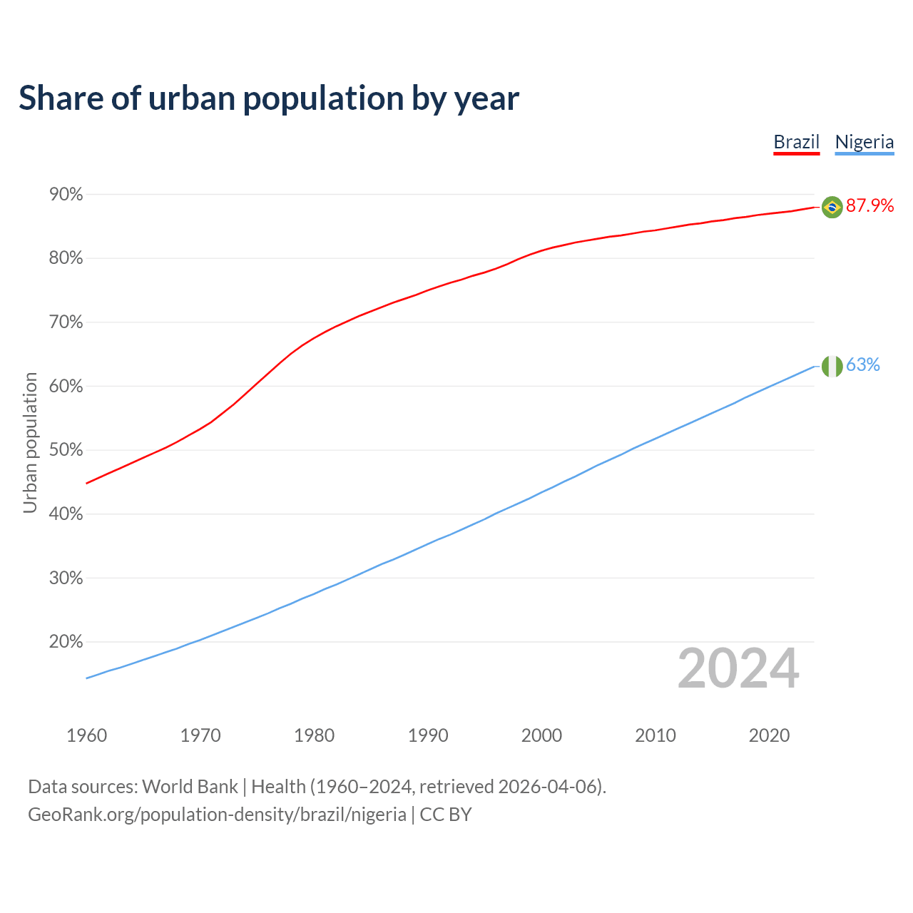 From 2004 to 2024, the share of urban population changed from 82.7% to 87.9% in Brazil and from 46.7% to 63% in Nigeria.