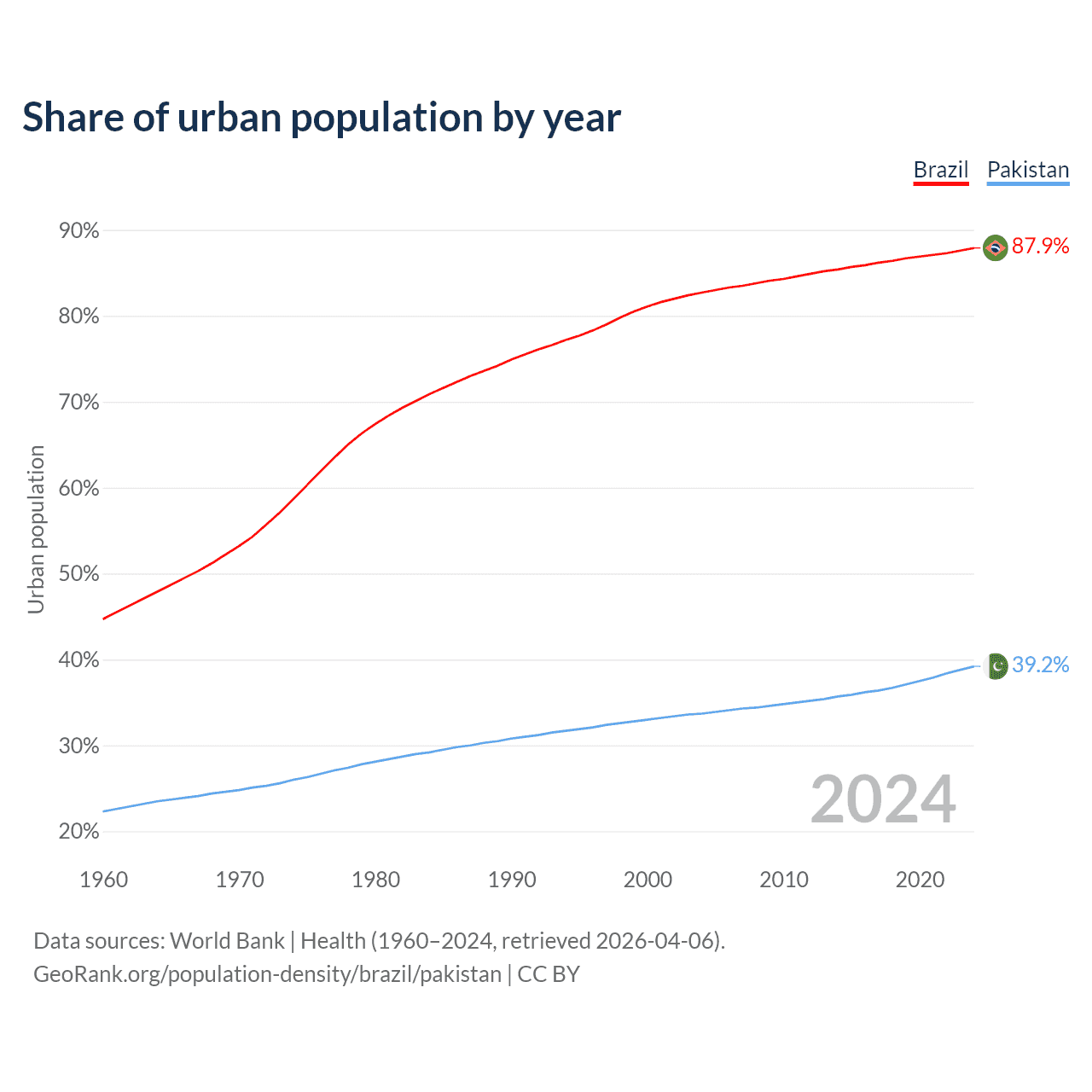 From 2004 to 2024, the share of urban population changed from 82.7% to 87.9% in Brazil and from 33.7% to 39.2% in Pakistan.